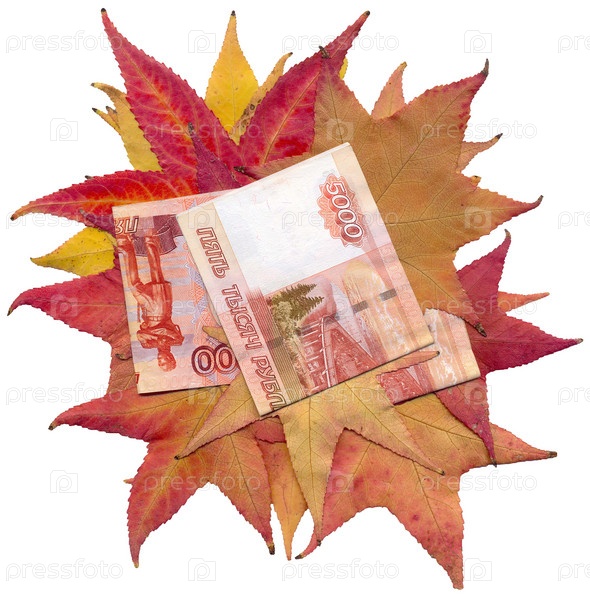 Пятитысячные купюры на листьях клена