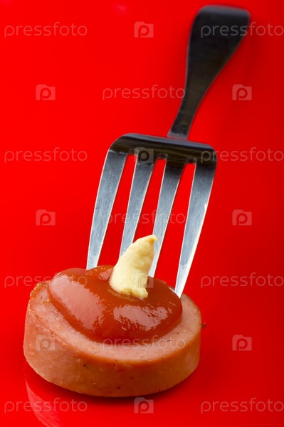 Сосиска с кетчупом и горчицей и вилка крупным планом на красном фоне