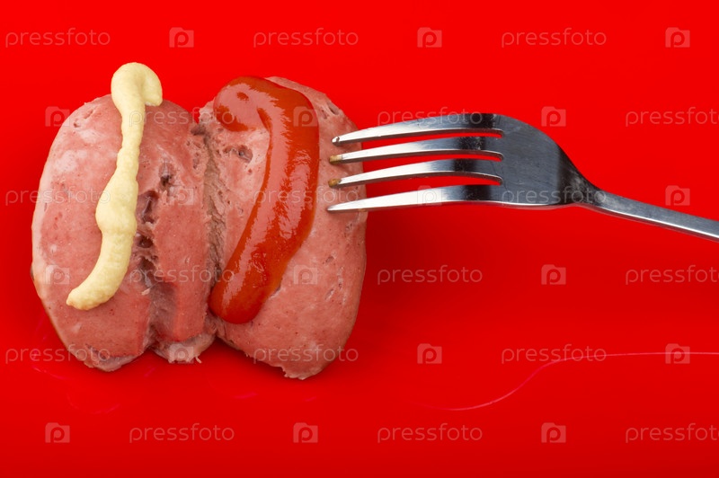 Сосиска с горчицей и кетчупом и вилка на красном фоне
