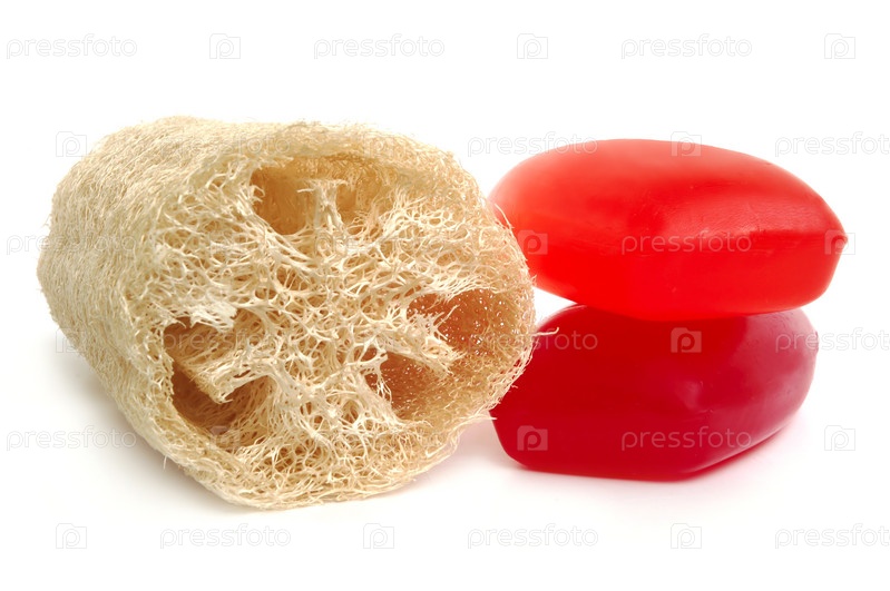 Мыло для личной гигиены и губка loofah на белом фоне