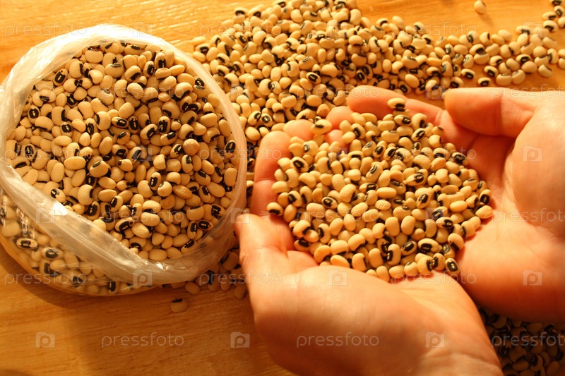 Желтые бобы в полиэтиленовом пакете и на бедре на столе