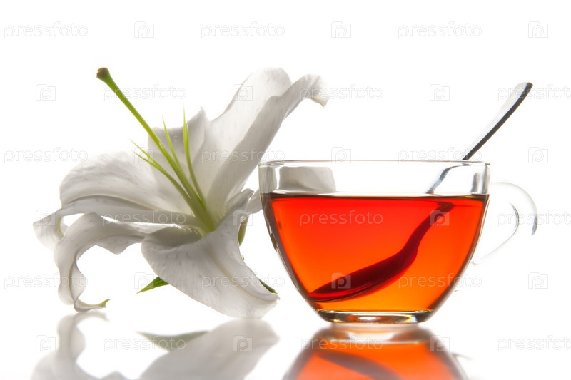 Стеклянная кружка с чаем и цветок белой лилии