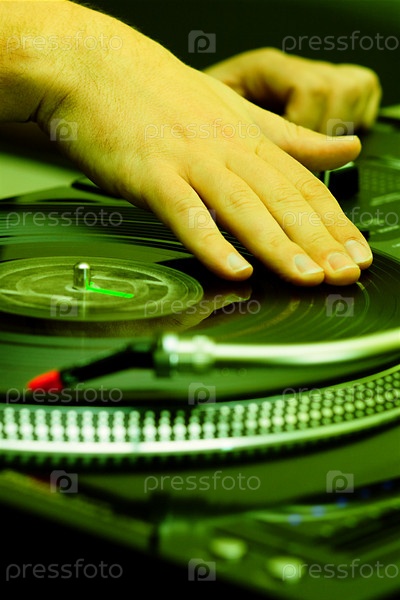 Рука диджея на виниловой пластинке