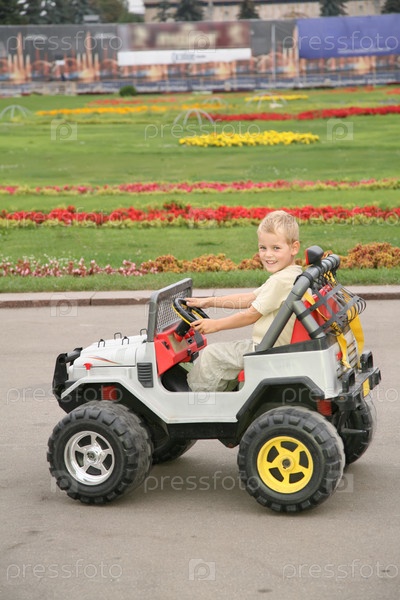 Мальчик в игрушечной машине в парке