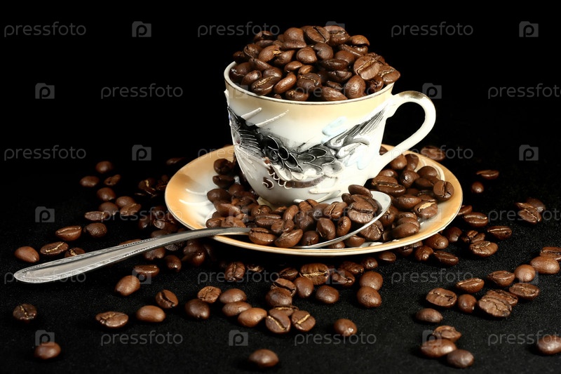 Фарфоровая чашка, наполненная кофейными зернами