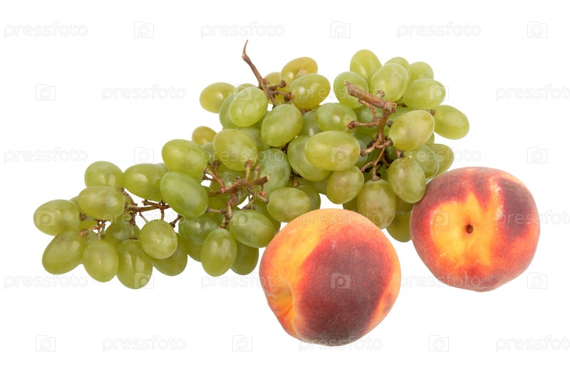 Виноград и два персика на белом фоне