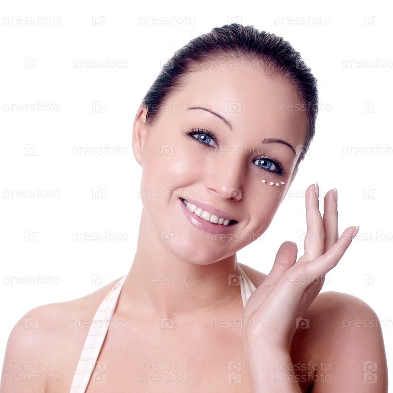 Девушка, улыбаясь, наносит крем на лицо