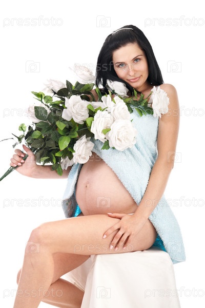 Беременная женщина с розами на белом фоне