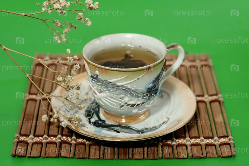 Чашка зеленого чая на бамбуковой салфетке и засушенная ветка