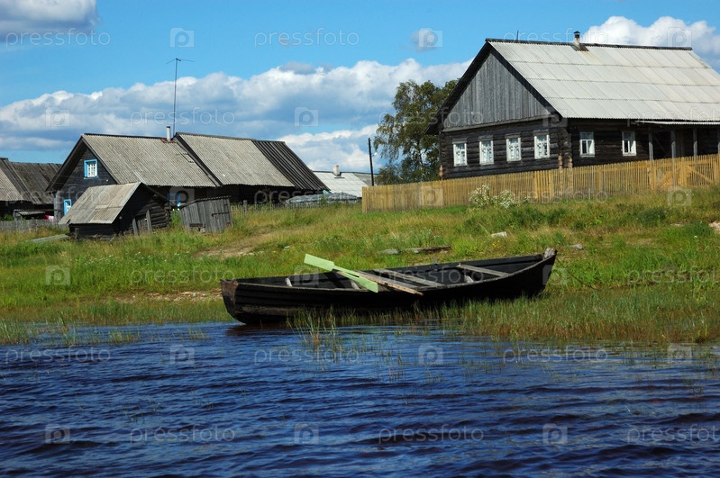 Северо-русское село Нокола со старой деревянной лодкой на переднем плане