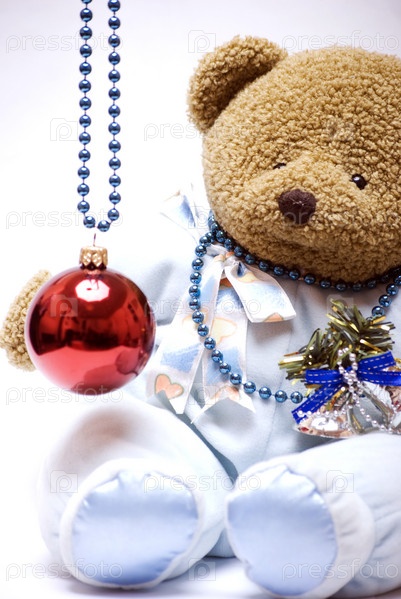 Плюшевый медведь с елочным красным шаром, новогодний подарок
