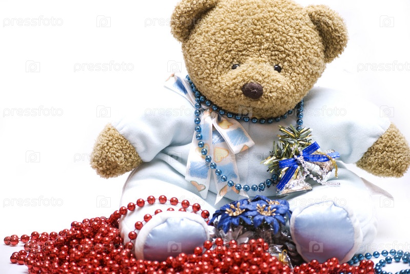 Плюшевый медведь с елочными гирляндами, новогодний подарок
