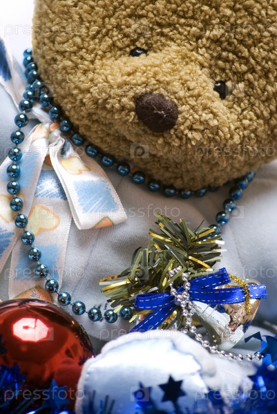 Плюшевый медведь с елочными гирляндами, новогодний подарок