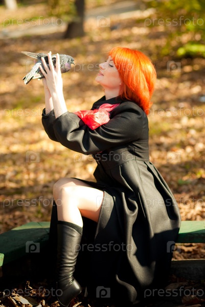 Красивая девушка в осеннем парке с голубкой