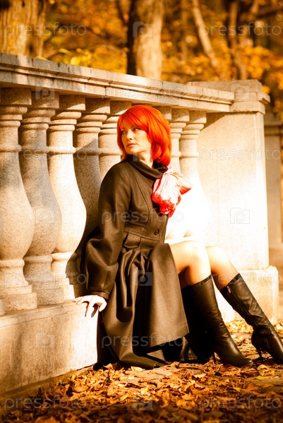 Осенью в парке отдыхает рыжеволосая красавица