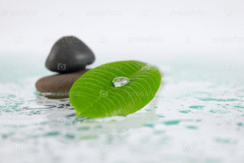 Зеленый лист с каплей росы на стекле, распыленном водой против удаленных камней вблизи