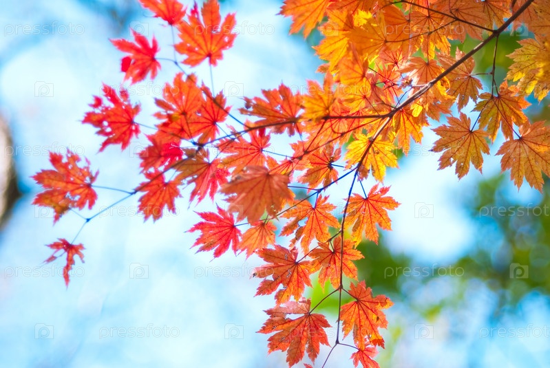 Разноцветные кленовые листочки на фоне неба