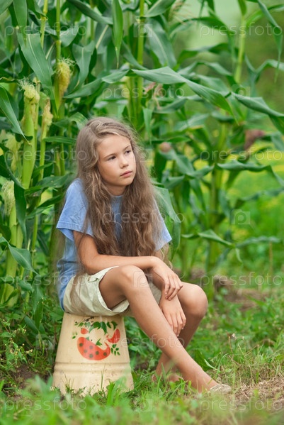 Девочка на кукурузном поле сидя на ведре