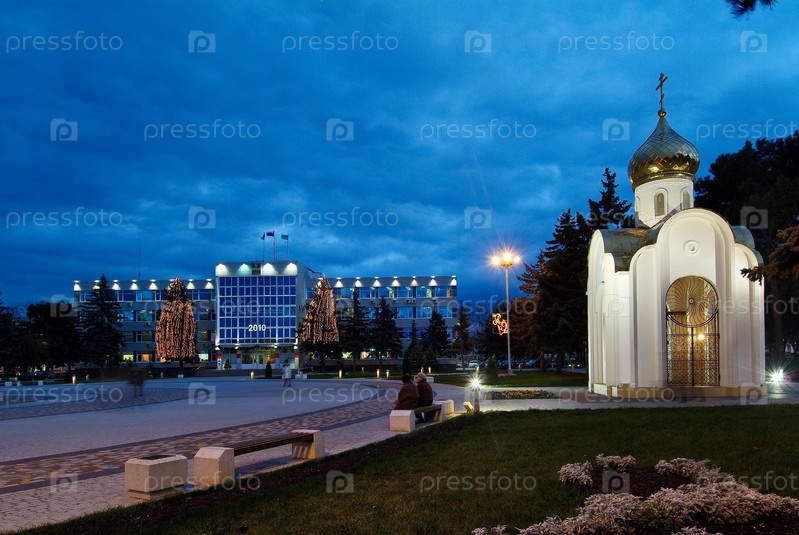Небольшая белая церковь в свете горящих фонарей
