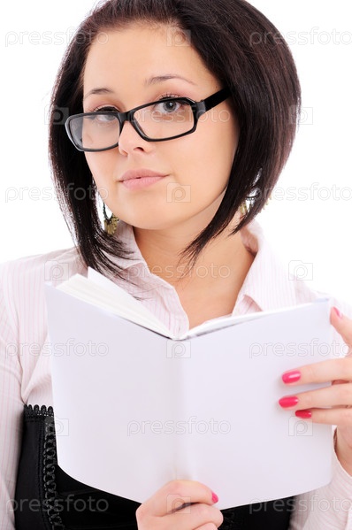 Портрет молодой симпатичной женщины в очках с книгой