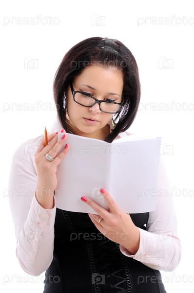 Портрет молодой симпатичной женщины в очках с книгой