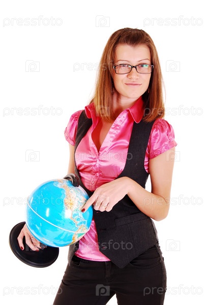 Молодая рыжая девушка с глобусом в руках на белом фоне