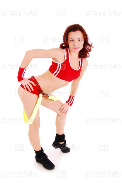 Молодая девушка в спортивном топе и шортах на белом фоне