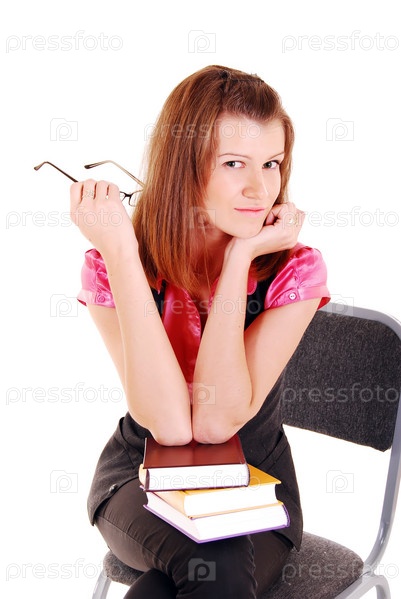 Молодая девушка, сидящая на стуле с книгами на коленях