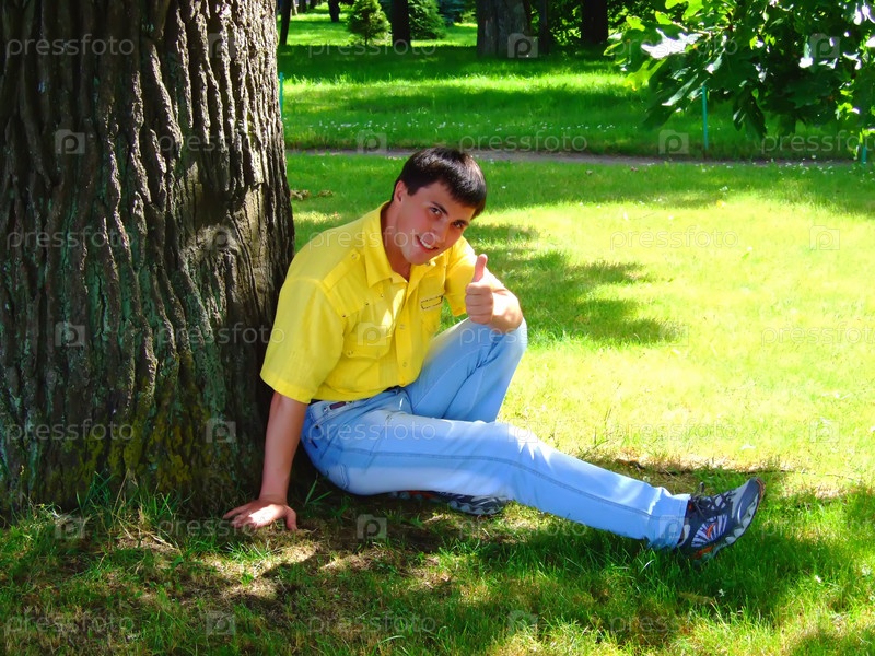 Молодой парень, сидящий около дерева в парке