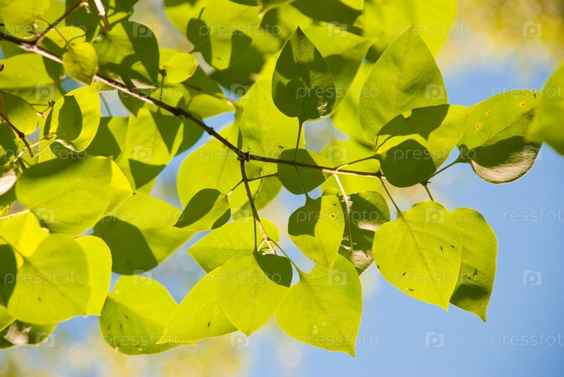Зеленые листья на фоне голубого неба
