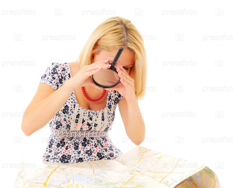 Привлекательная блондинка изучает карту на белом фоне