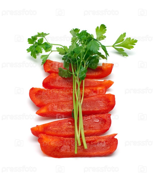 Ломтики красного болгарского перца и петрушка на белом фоне