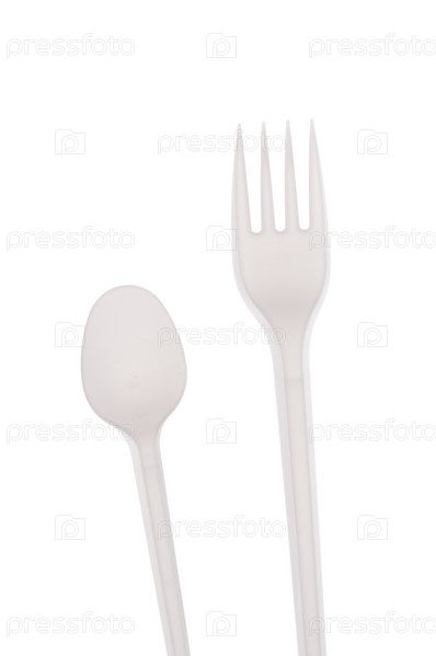 Пластиковые, одноразовые вилка и ложка на белом фоне