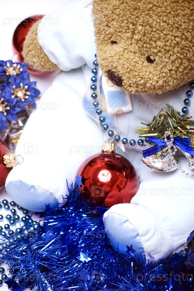 Плюшевый мишка с новогодними шарами, гирляндой и мишурой