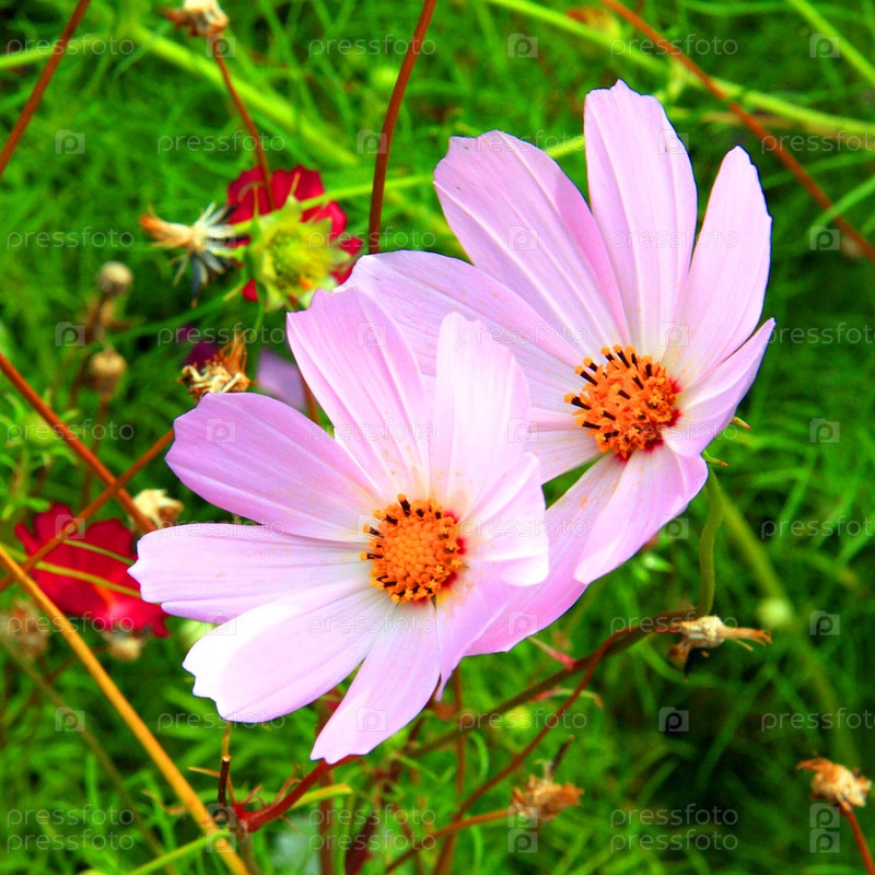 Цветы космеи на газоне