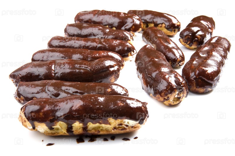 Множество эклеров в шоколадной глазури, изолировано на белом фоне