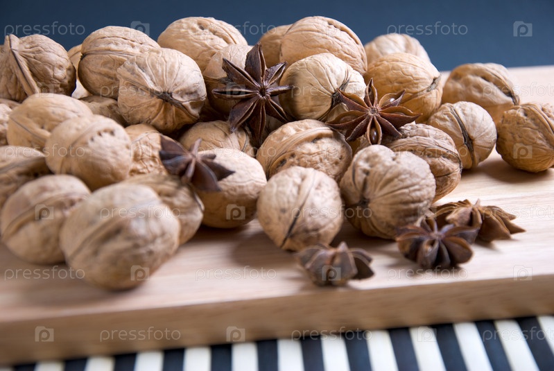 Грецкие орехи и анис на деревянной доске