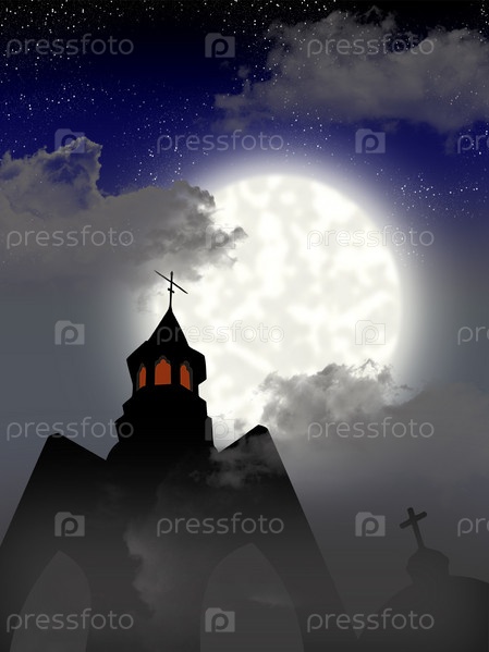 Вершины зданий с крестами на фоне ночного неба с полной луной