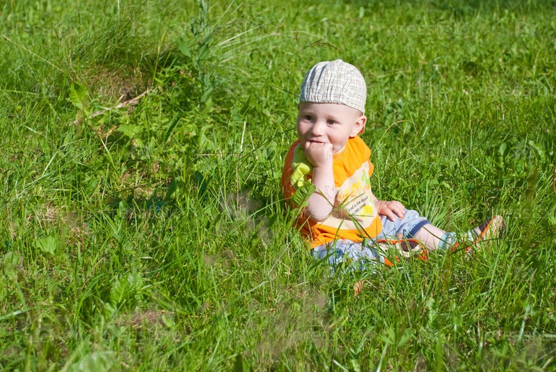 Маленький ребенок сидит на траве
