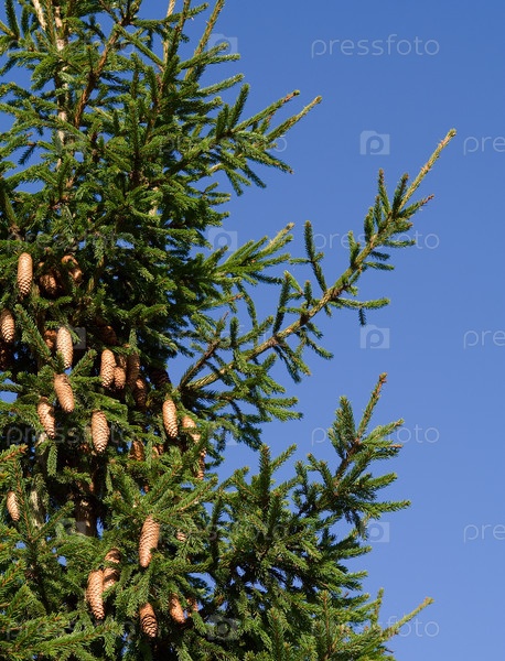 Фиртри с конусами на голубом небе
