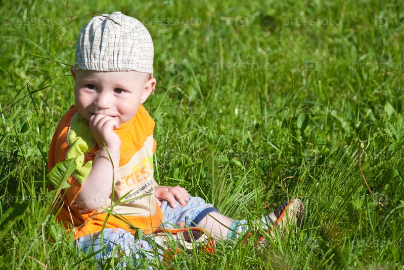 Маленький ребенок сидит в траве