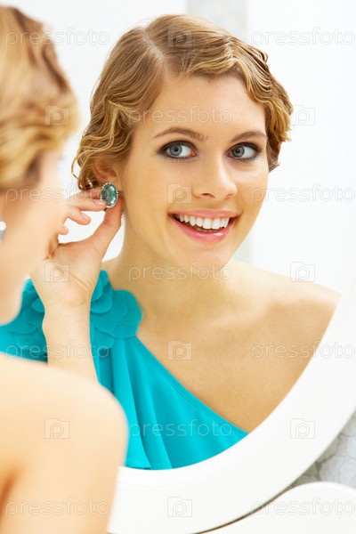 Молодая женщина смотрит на свое отражение в зеркале
