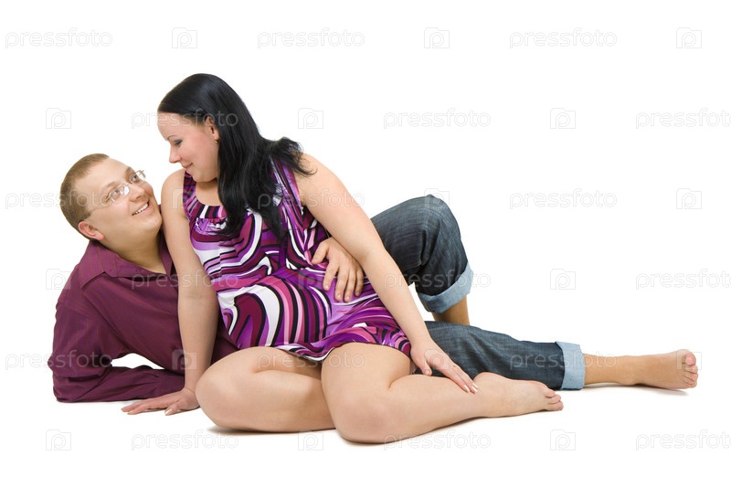 Молодой муж и его беременная жена на белом фоне