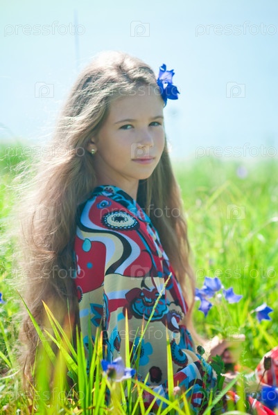 Девочка на поле с голубыми колокольчиками