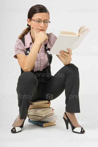 Молодая женщина, сидящая на стопке книг в очках и с книгой в руках