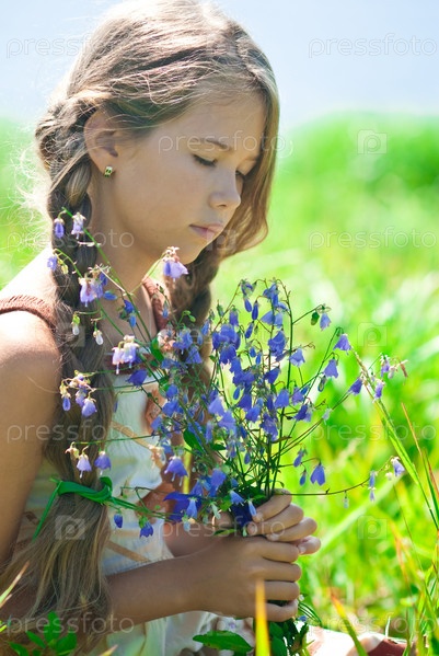 Девочка на лугу с букетиком голубеньких колокольчиков