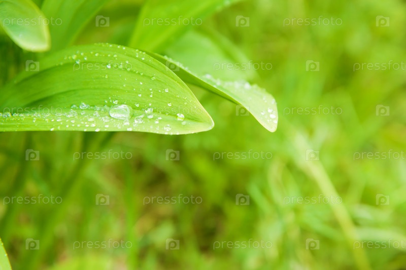 Широкие зеленые листья дикого чеснока с каплями дождя на фоне природы
