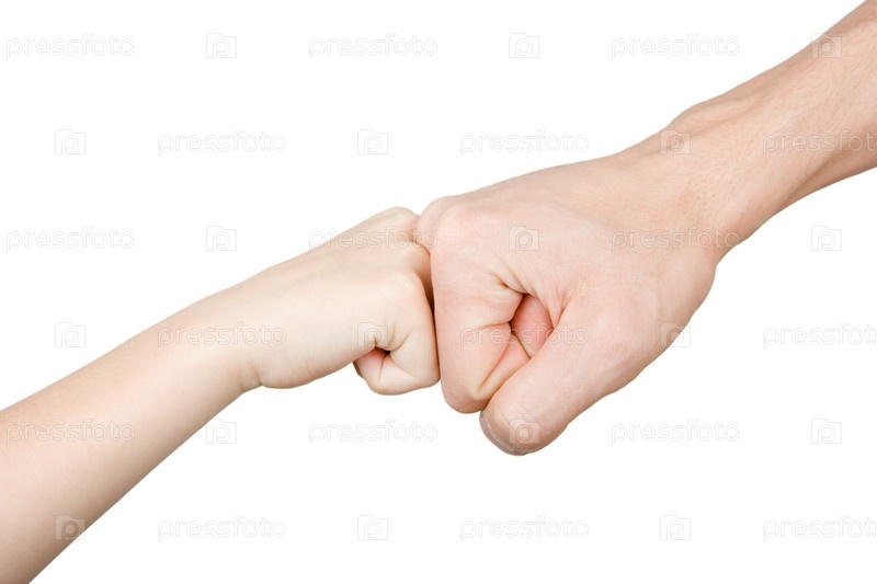 Кулак ребенка опирается на кулак взрослого на белом фоне