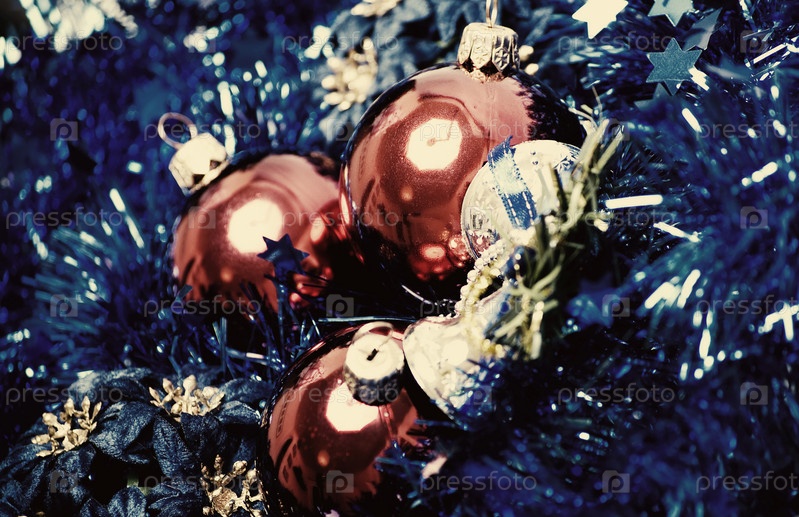 Красные елочные игрушки с синей мишурой