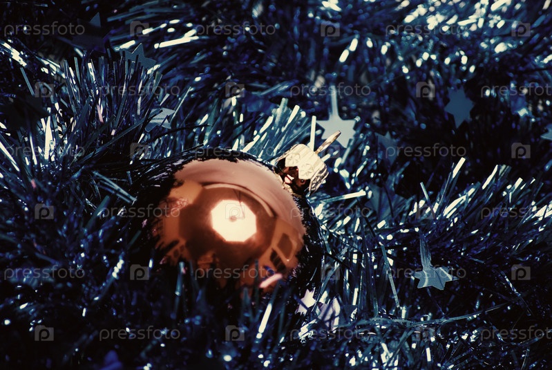 Красная елочная игрушка с синей мишурой